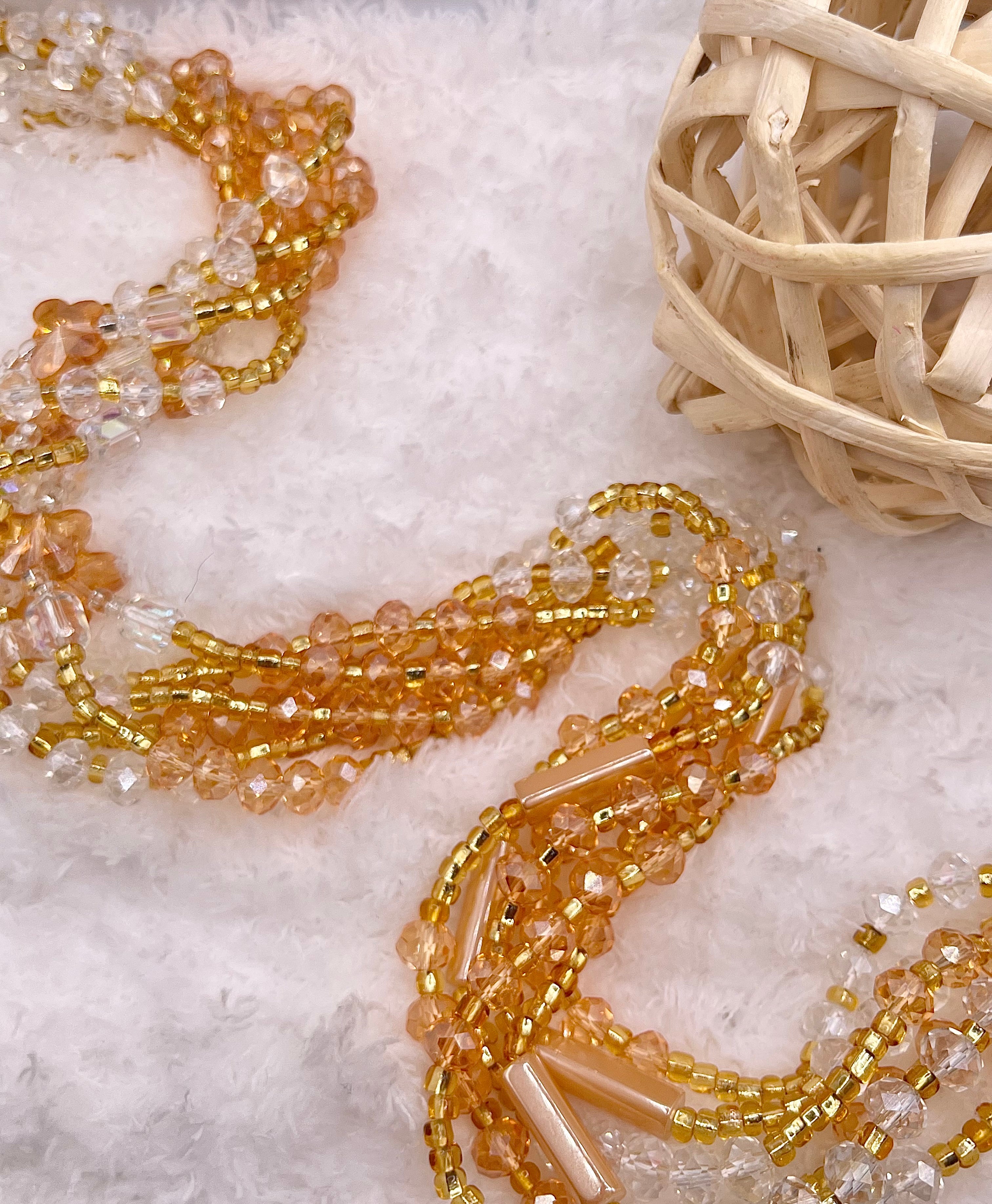 Elevate your look with our exquisite Chandelier. Adorned with 10mm clear and gold rondelle crystals and delicate 2mm gold seed beads, this waistbead will add a touch of luxury and sophistication to any outfit. Make a statement and stand out from the crowd with this exclusive piece.