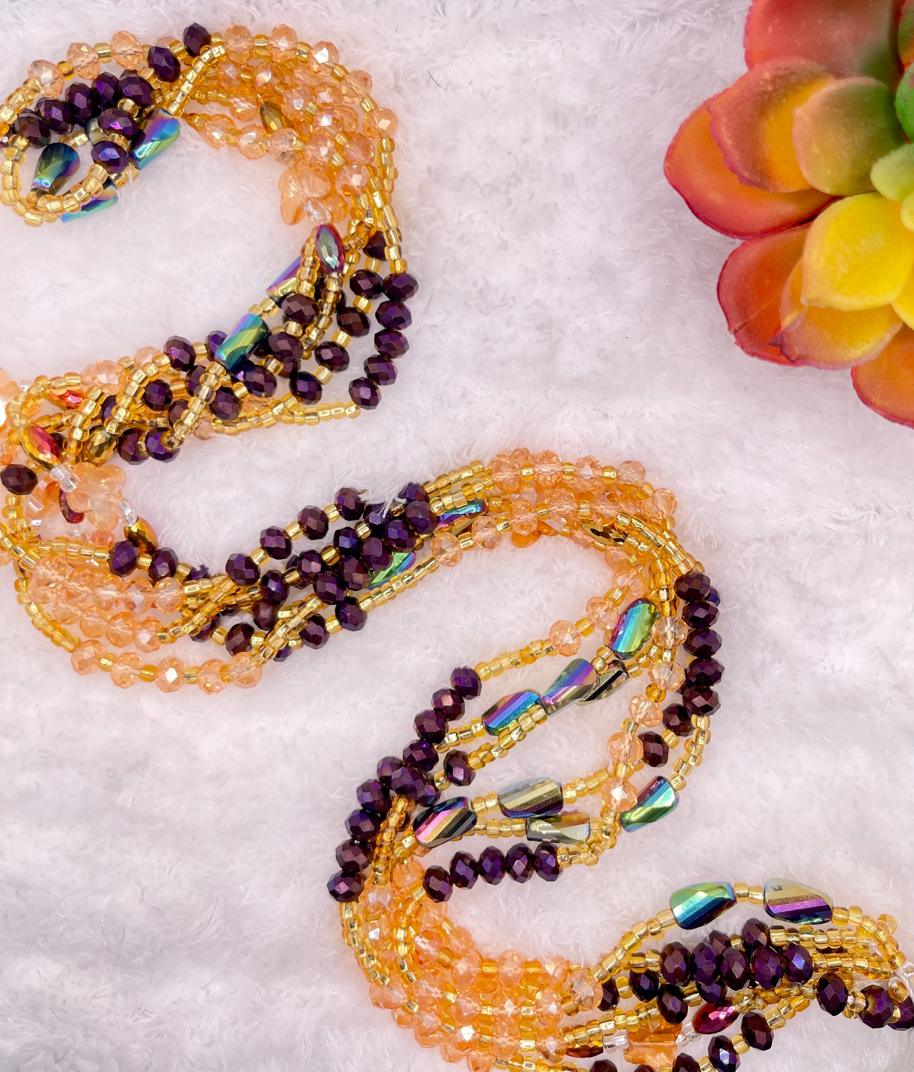 Unleash your inner goddess with Purple Haze waistbeads. Made with 10mm purple and gold rondelle crystals, accent beads, and 2mm gold seed beads, these waistbeads will add a touch of color and elegance to your waistline. Energize your senses and embrace your feminine power with Purple Haze.