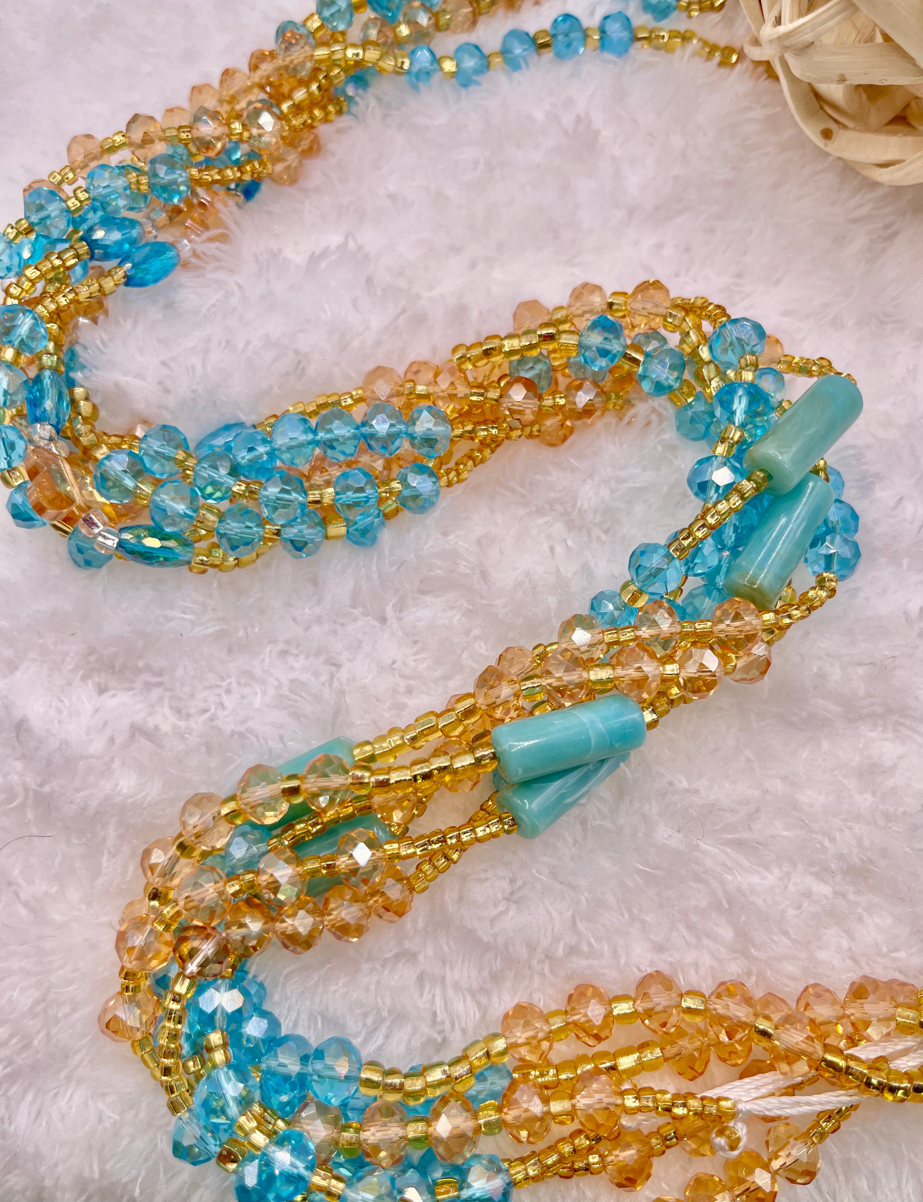 Indulge in opulence with Skyline's 10 mm blue and gold rondelle crystal accent beads and 2mm gold seed beads. Elevate your style with these luxurious waistbeads, adding a touch of glamour and sophistication to any outfit.